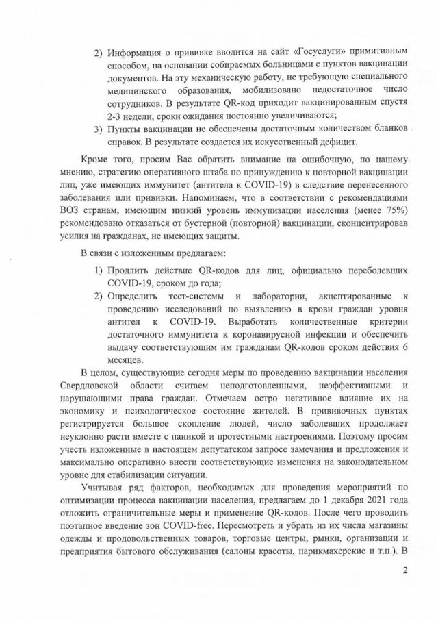 Парламентарии предлагают отложить применение QR-кодов до 1 декабря, разрешить людям с антителами получать QR-коды сроком на полгода, продлить действие кодов для официально переболевших до года, вместо 6 месяцев, ускорить процедуру получения сертификатов о вакцинации и прекратить практику отстранения от работы не привитых.