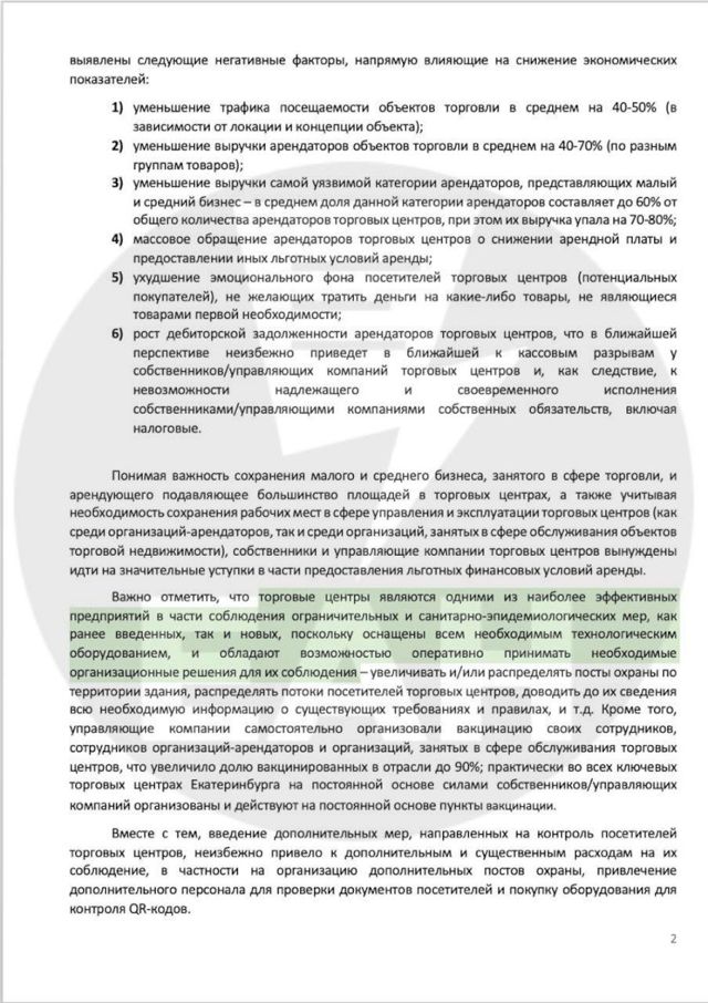 «Торговые центры являются одними из наиболее эффективных предприятий в части соблюдения ограничительных и санитарно-эпидемиологических мер, как ранее введенных, так и новых, поскольку оснащены всем необходимым технологическим оборудованием и обладают возможностью оперативно принимать необходимые организационные решения для их соблюдения», - указывают авторы письма.