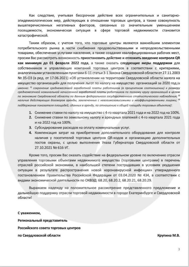 Также владельцы торговых центров просят снизить им ставку на налог на имущество и земельный налог, субсидии на оплату коммунальных услуг, компенсировать затраты на оборудование для проверки QR-кодов. Представители ТЦ настаивают, что активно содействуют прививочной кампании на территории региона. Так, по данным Министерства здравоохранения Свердловской области, с 30 октября по 17 ноября 2021 года привито в выездных пунктах вакцинации в торгово-развлекательных центрах 65 528 человек.