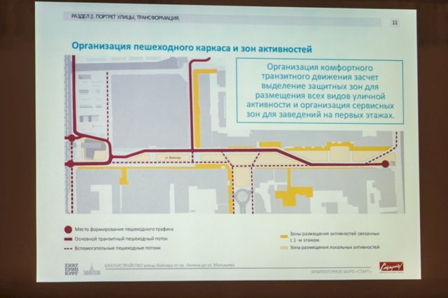 Также члены открытого консорциума предлагают создать наземный пешеходный переход через улицу Малышева, оборудовать крышу над подземным переходом, а само пространство под дорогой - отдать бизнесу. В тупике на улице Попова можно сделать сцену для уличных музыкантов, чтобы у них было место для выступлений, а также привести вывески зданий к единому виду, вернуться к историческим фасадам зданий.