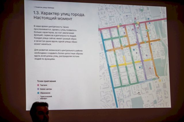 Первыми выступили представители Открытого консорциума. Архитектор Илья Полянских выделил четыре текущие проблем улицы Вайнера - визуальный шум, неблагополучные маргинальные посетители улицы, обильное количество лавочек, отсутсвие общего вектора развития.