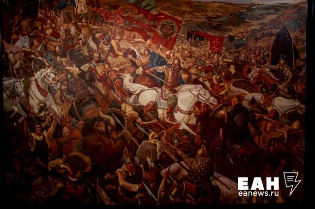 А самая, пожалуй, впечатляющая картина в этом зале – работа Сергея Присекина «С Победой»: это как будто резюме всей истории битвы. Как и любое столкновение, с обеих сторон было много жертв, поэтому завершилось оно так называемым «стоянием на костях» – 8 дней русские оставались на поле боя, чтобы захоронить всех павших воинов. «Мы не знаем точно, как именно происходило захоронение – как изображено на картине или иначе. Но она, безусловно, оставляет сильное впечатление: порой убедительность изобразительного искусства сильнее, чем документальных произведений», - комментирует наш экскурсовод.