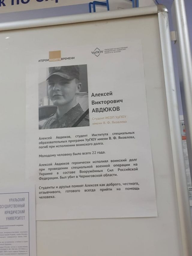 «Студенты и преподаватели Института специальных образовательных программ УрГЮУ имени В. Ф. Яковлева простились с Алексеем Авдюковым. Студент группы ИСОП101Б-ПЮ-вф-со погиб при исполнении воинского долга. Алексей Авдюков героически исполнял воинский долг при проведении специальной военной операции на Украине в составе Вооруженных сил России. Был убит в Черниговской области», - сказано на сайте вуза.