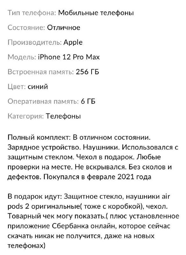 «iPhone 13 pro max, 256 gb. Сбербанк уже установлен! Почему это важно? Потому что теперь на айфон нельзя установить это приложение, его нет в AppStore, он есть только там, где был установлен ранее», – указано в объявлении.