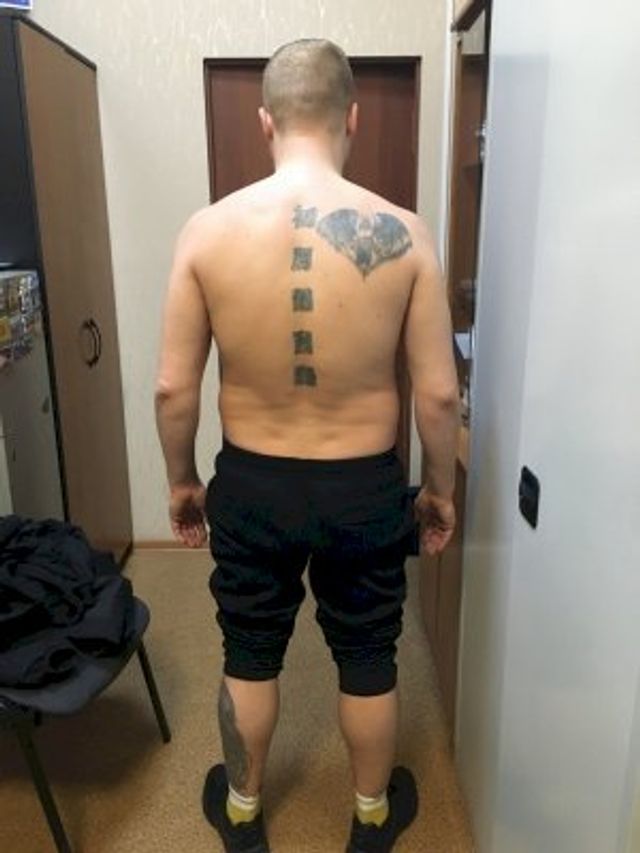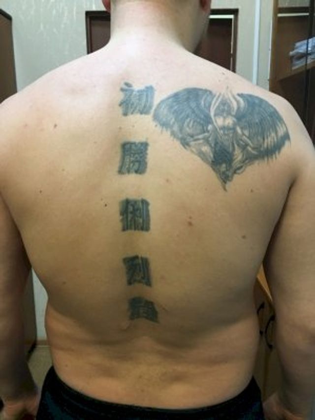 Особые приметы задержанного: на спине, вдоль позвоночника расположена татуировка в виде 5 иероглифов, на правой лопатке нанесено изображение крылатого человекоподобного существа, на левой ноге изображена татуировка биомеханической тематики, отсутствует часть передних зубов, в паховой области имеется шрам размером 8 - 10 см.