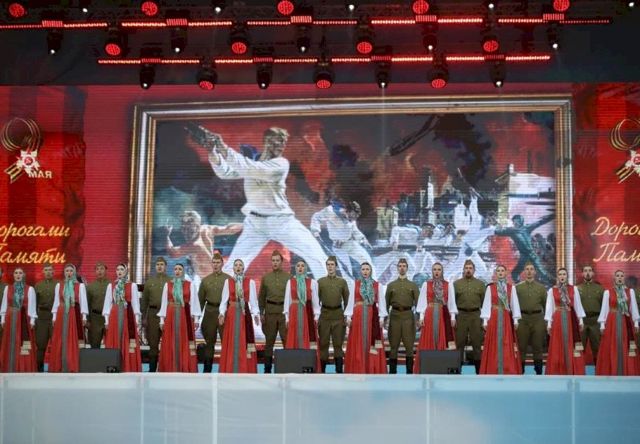 Вторая часть концерта началась с проникновенных строк. Мерзликин вновь читал Рождественского. После этого выступали Уральский государственный академический русский народный хор во главе с Николаем Зайцевым, квартет «Урал» и заслуженный артист России Михаил Уляшкин, режиссер Валерий Долганов и идейный автор программы «Дорогами памяти» Сергей Исаев. А уже перед выходом группы «Любэ» артисты народного хора вынесли на сцену портреты своих родственников-ветеранов войны.