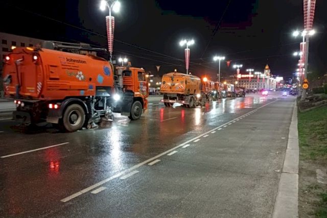 На улицах работало около 160 единиц техники. В том числе, сразу после полуночи по проспекту Ленина прошла колонна поливомоечных машин, украшенных наклейками с буквой Z. Техника провела влажную уборку центра города, попутно собирая мусор. Работу сопровождали экипажи ГГИБДД. Также специалисты очистили работали и в других районах столицы Урала, в том числе вывозили скопившиеся отходы их мусорных баков во дворах.