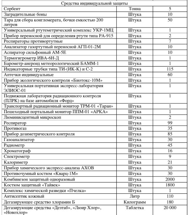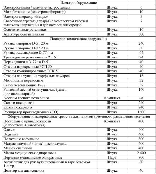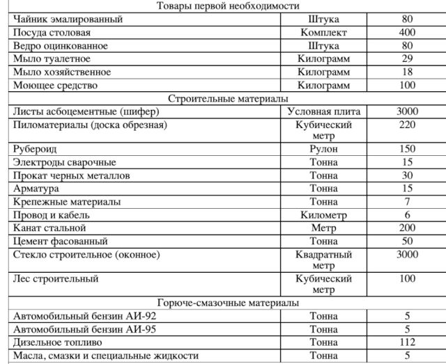 Размер запаса определяет приложение к постановлению. Согласно ему, в продовольственный запас вошли мука (1840 кг), хлеб, картофель, крупа, морковь, капуста, лук, детское фруктовое пюре, сахар, печенье и другие продукты. В товары первой необходимости вошли чайник, посуда, ведро, мыло и моющее средства. Также в списке можно найти бензин, электрооборудование и мебель для пунктов временного размещения.