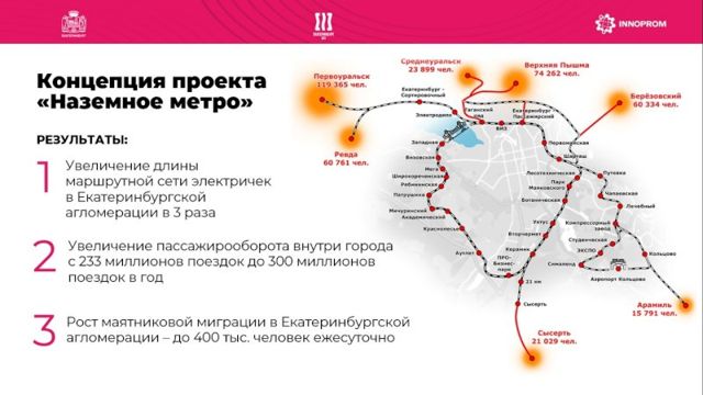 Мэрия Екатеринбурга представила план будущего наземного метро, строительство которого запланировано на 2024-2030 гг. Схема была представлена в рамках международной выставки «Иннопром». Согласно плану, длина маршрутной сети электричек в Екатеринбурге увеличится в три раза.