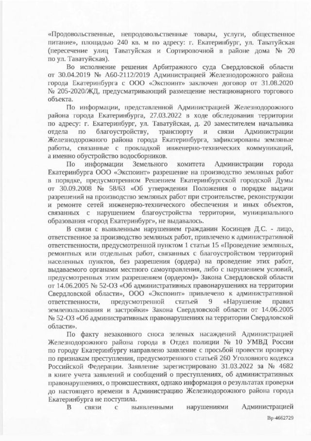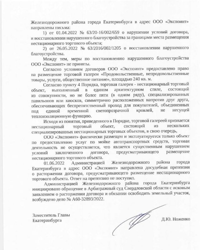 О подаче заявления в суд рассказал вице-мэр Дмитрий Ноженко в ответ на запрос депутата Госдумы Андрея Альшевских. По словам чиновника, еще 1 июня администрация района направила ООО «Экспоинт» досудебную претензию о расторжении договора. Застройщик на это письмо не ответил. После этого райадминистрация обратилась в Свердловский Арбитраж.