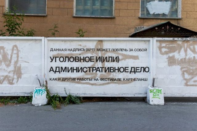 Первая работа от участников «Карт-бланша», объединения «ПСЛЧ», появилась на заборе рядом с гостиницей «Большой Урал». «Данная надпись (арт) может повлечь за собой уголовное и (или) административное дело, как и другие работы на фестивале “Карт-бланш”», - написано на заборе.