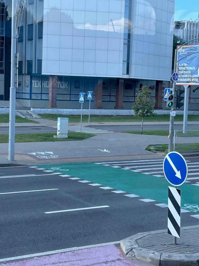 Для тех, кто предпочитает передвигаться самостоятельно, в Минске есть возможность кататься на электросамокатах и велосипедах. В городе есть сервисы кикшеринга, например, Whoosh, который минчане называют «Вош», и сервисы по аренде велосипедов. Но, что важнее, для них есть соответствующая инфраструктура – велодорожки. На пешеходных переходах есть специально выделенные полосы для велосипедистов. Самая большая и привлекательная для туристов велодорожка проложена через весь город и частично проходит по городской набережной. Удивительно, но знаки велодорожки я видела даже в населенном пункте, в котором живут всего 9 тыс. человек.