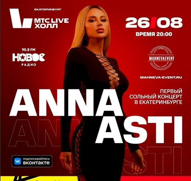 Известная поп – певица АNNA ASTI выступит в уральской столице. Артистка даст первый сольный концерт на Урале после начала сольной карьеры (девушка вышла из проекта с Artik). Концерт состоится 26 августа в МТС Live Concert Hall.