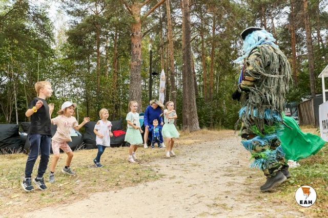 С яркими рисунками на лицах дети бежали играть в компании Водяного и Кикиморы от «Парка сказов». Аниматоры развлекали гостей активными играми и веселыми шутками.