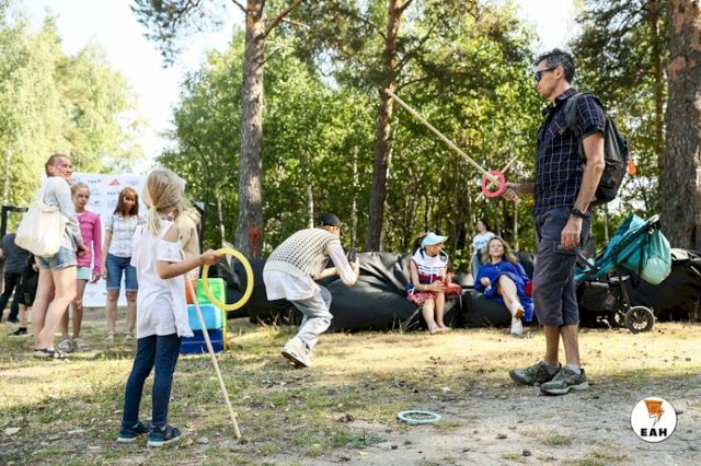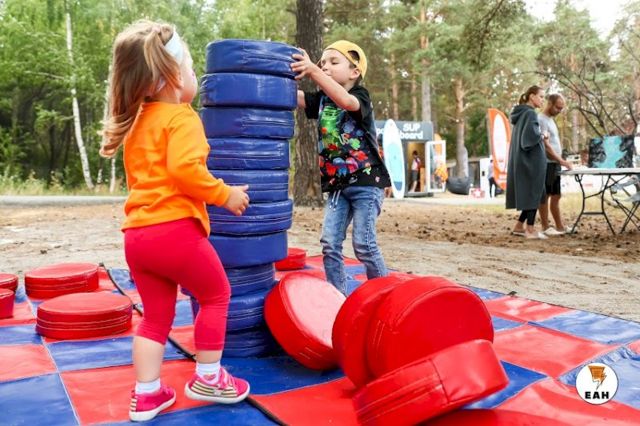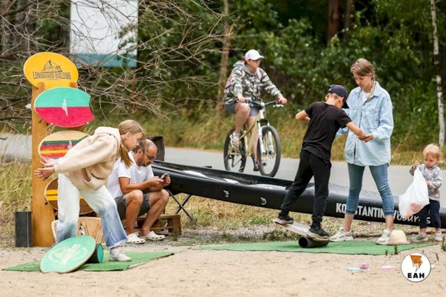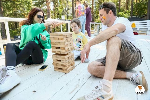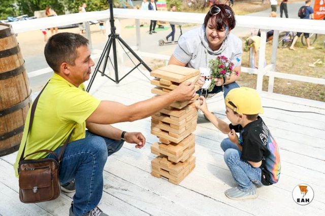 С самого утра на берегу озера расположилось несколько зон с разными активностями. Пришедшие на фестиваль семьи с детьми сразу облюбовали гигантские шашки, дженгу, огромный кубик-рубика.