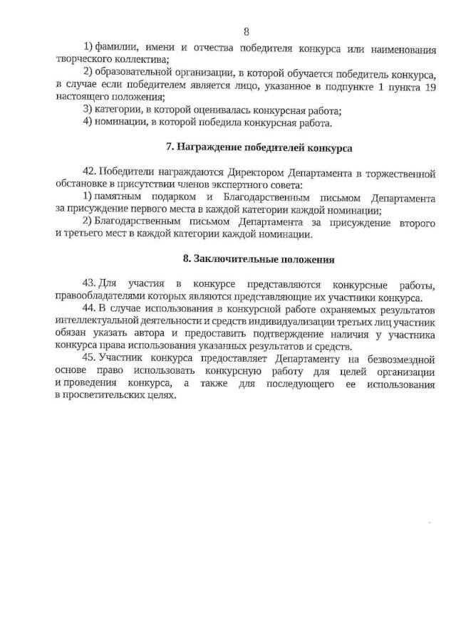 Для оценки выработаны схожие критерии. В первую очередь, новизна идеи, глубина интерпретации темы, целостность композиции, образность мышления. Победителей конкурса будут определять путем опроса на сайте департамента. По его итогам участникам за первое место обещают памятные подарки и благодарственные письма департамента. А тем, кто займет вторые и третьи места, выдадут благодарственные письма.