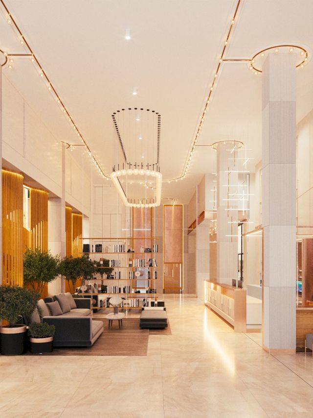 В пространстве с высокими – в 6 м – потолками расположена единая зона ресепшен с консьерж-обслуживаением, а также уютная зона ожидания с мягкой мебелью и рестораном. Атмосферу роскоши и изящества поддерживают элементы декора, расположенные на дизайнерских стеллажах и журнальных столиках. Здесь можно провести встречу или подождать такси, наслаждаясь приятной музыкой в стиле лаундж.
