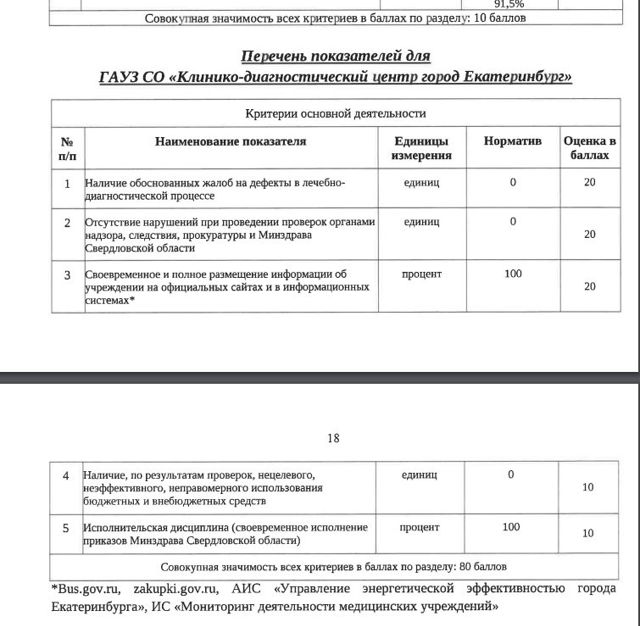 Отдельно будут учитываться и обоснованные жалобы на организацию и качество оказания медпомощи, приведших к тяжелым нарушениям здоровья, инвалидности или смерти. Кроме того, премию главврачу и вовсе могут срезать на 50%, если тот получил дисциплинарное взыскание или зафиксировано нецелевое использование бюджетных средств на сумму 100 тысяч рублей. Премию могут полностью отменить, если у больницы обнаружится просроченная кредиторская задолженность за счет средств ОМС или областного бюджета, или за низку оценку работы медучреждению. Отметим, что в документе отдельно прописаны все критерии и баллы для каждого медучреждения.