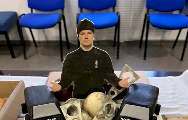 На торте закреплена фигура Егорычева и два катафалка Mercedes-Benz с надписью «Успение». Егорычев получил этот торт на 46-летие. Коллеги решили внести немного хорошего настроения в их работу, которая является сложной в психологическом плане.