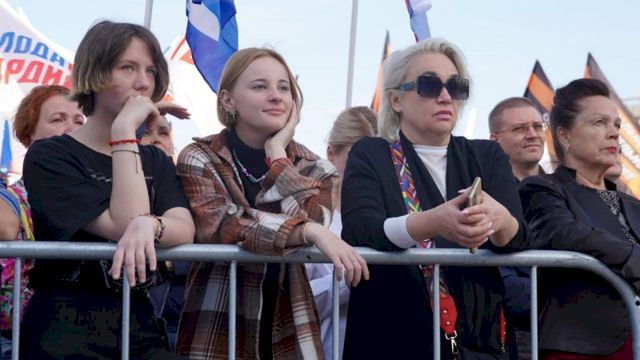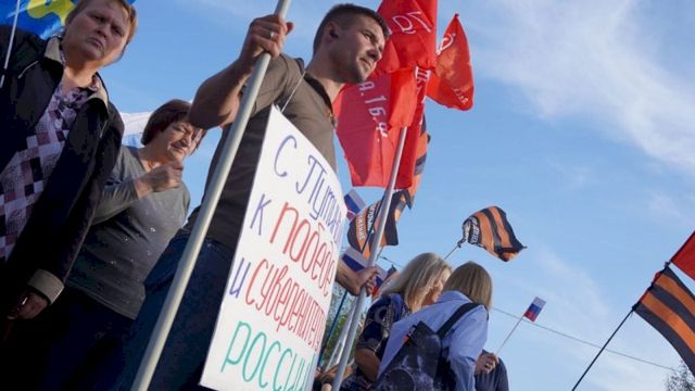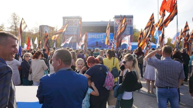 К 16.00 на площадке собралось несколько сотен человек. У многих в руках были российские флаги, символика парламентских партий и плакаты с патриотическими лозунгами. В приветственном слове Вадим Самойлов выразил поддержку участникам акции. Музыкант призвал: «Пускай будет мир, пусть люди прекратят друг друга убивать».