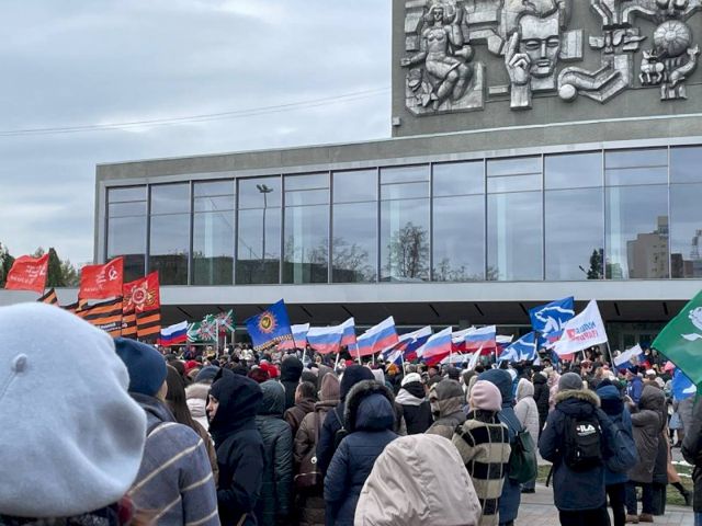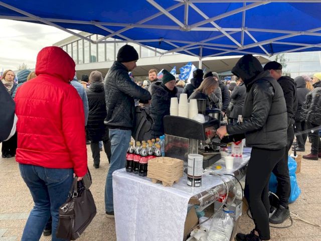 На мероприятие собрались несколько сотен человек. Судя по флагам, которые развеивались над толпой, поддержать жителей бывших территорий Украины пришли представители «Единой России», «Молодой гвардии», ЛДПР, КПРФ, НОД и других общественных организаций. Также посетители могли подкрепиться френч-догами, кофе и глинтвейном.