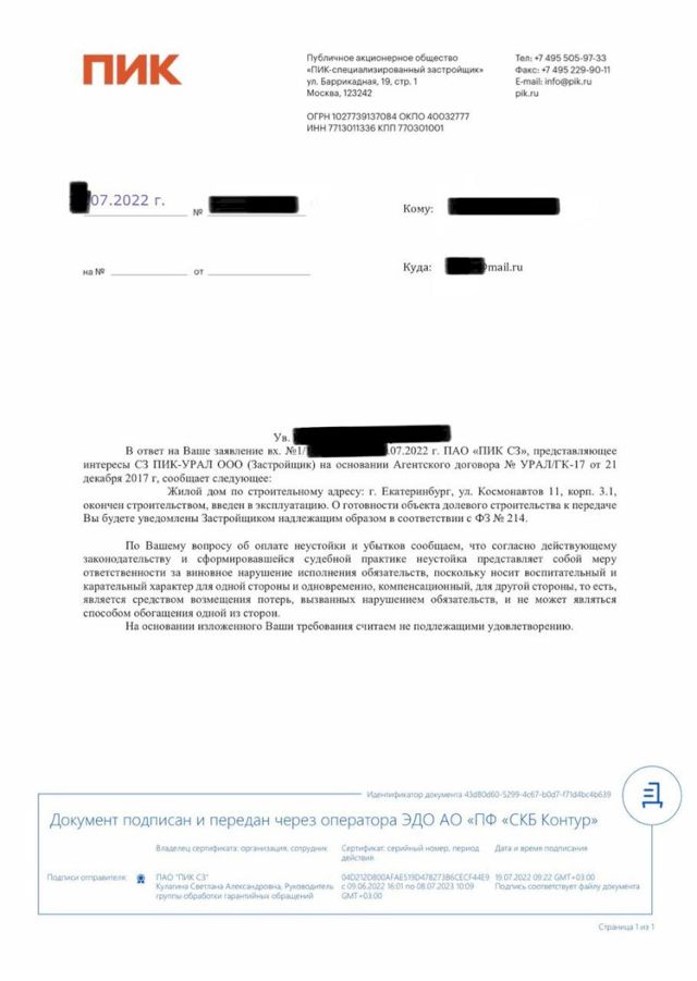 О ситуации в ЖК «Космонавтов, 11» ЕАН рассказали сразу несколько клиентов ПИК. Они уже успели записать детей в школы и детсады рядом с будущим домом. Вначале компания ПИК перенесла заселение на месяц. Потом - еще на один. Согласно последней рассылке, которую получили будущие жильцы, вручение ключей в очередной раз перенесли на конец ноября. В сентября 2022 года в администрации Екатеринбурга в ответе на обращение собственников подтвердили, что разрешительные документы на объект выданы.