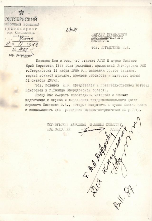 Студенты и преподаватели Уральского государственного лесотехнического университета сегодня, 1 ноября, почтили память Юрия Исламова. Бывший студент лесоинженерного факультета вуза 35 лет назад погиб в Афганистане. Он, единственный в Свердловской области, получил звание Героя Советского Союза за совершенный подвиг. К сожалению, награда была вручена посмертно.