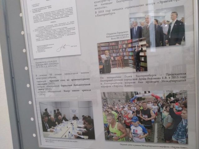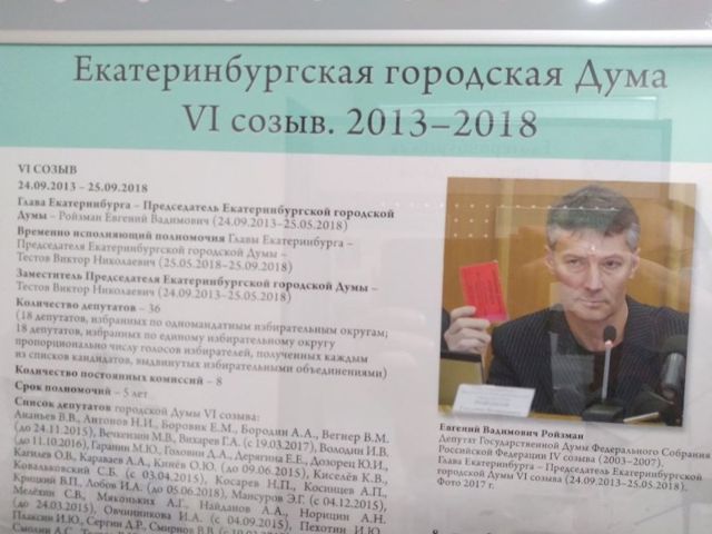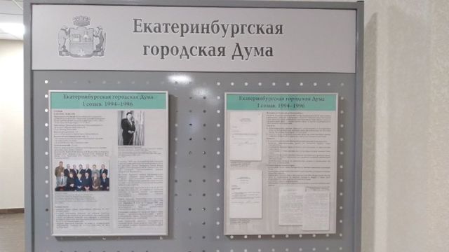 В самой экспозиции отображена, в том числе, вся современная история Екатеринбургской гордумы. Отдельная часть посвящена шестому созыву 2013-2016 годов. Также отдельно указано, что в тот период впервые был избран на пост председателя ЕГД — главы Екатеринбурга Евгений Ройзман.
