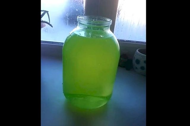Мужчина рассказал, что в поселке живет его мама. Она набрала в банку воды, и жидкость в ней действительно имеет зеленый цвет.