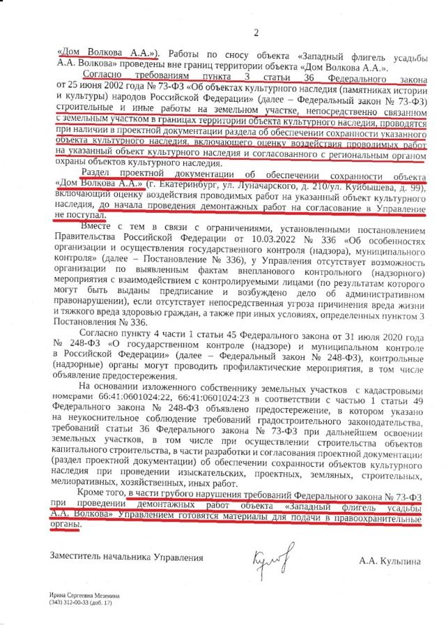 В письме говорится, что застройщик не согласовал границы проведения работ рядом с самой усадьбой, которая имеет статус объекта культурного наследия. К такому выводу пришли сотрудники по итогам проверки, проведенной на месте снесенного флигеля 18 января 2023 года.