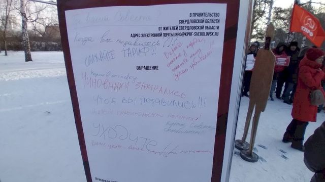 Перед началом акции возле баннера выстроились с десяток человек с маленькими плакатами. На одном из них было прописано требование установить тарифы как в Тюмени. Участник, державший этот плакат, отказался пояснять корреспонденту ЕАН, почему его так привлекли тарифы в соседнем регионе.