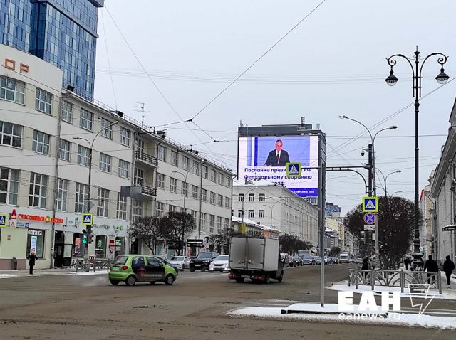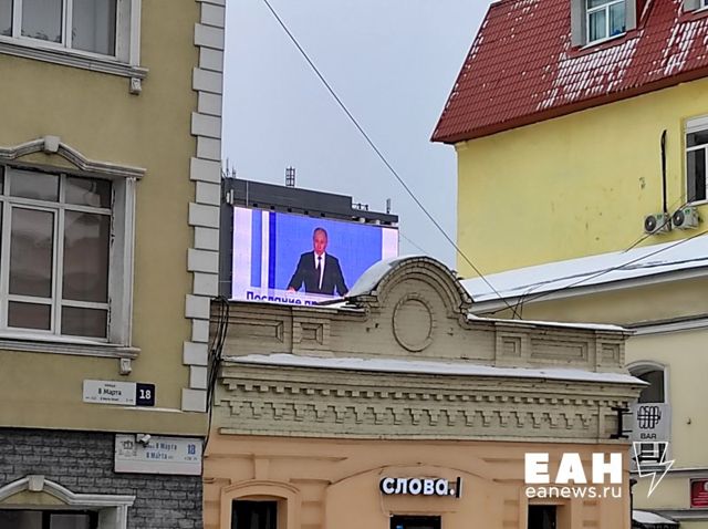 Послание президента Владимира Путина Федеральному собранию транслируют на медиаэкранах Екатеринбурга. Об этом сообщает корреспонедент ЕАН.