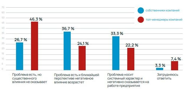 Стоит отметить, что собственники предприятий и их топ-менеджеры разнятся в оценках кадрового кризиса на предприятиях. Владельцы бизнесов оценивают ситуацию с кадрами негативнее, чем руководители предприятий. Треть собственников полагает, что проблема с кадрами — системная и негативно сказывается на предприятии. Их мнение разделяют только 22,2% топ-менеджеров. Признают проблему и прогнозируют рост ее влияния на бизнес 36,7% собственников и 24,1% руководителей. 26,7% собственников о проблеме знают, но сомневаются в ее влиянии на бизнес. Такую позицию разделяет большинство — 46,3% топ-менеджеров предприятий.