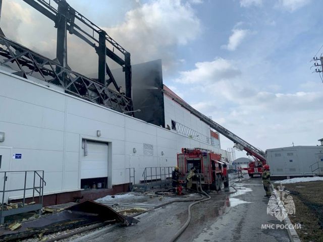 Пожарным удалось предотвратить распространения огня на склад с легковоспламеняющимися веществами. Из-за высоких температур на месте пожара обрушилась стена на площади 100 кв. м. Внутри здания происходят хлопки емкостей с воспламеняющимися жидкостями. Работают беспилотники-разведчики.