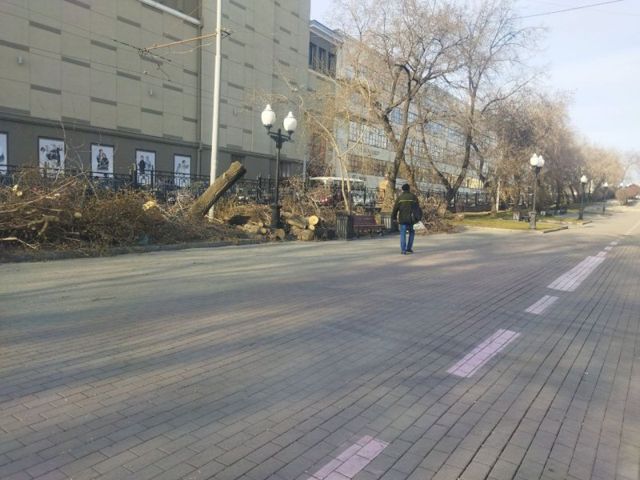 Сегодня в Екатеринбурге в аллее на улице Ленина между Карла Либкнехта и Тургенева вырубили несколько деревьев. Остатки многолетних, но с виду совершенно здоровых стволов до сих пор лежат между лавочками и фонарями, передает корреспондент ЕАН.