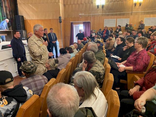 Первый заместитель свердловского губернатора Алексей Шмыков и министры по поручению главы региона Евгения Куйвашева проводят встречу с жителями поселка Сосьва, чьи дома сгорели при пожаре.