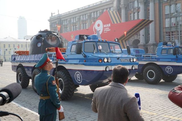 В Екатеринбурге сегодня по Площади 1905 года прошел традиционный парад войск, приуроченный к 78-й годовщине победы в Великой Отечественной войне. Особенностью церемонии в этом году стало отсутствие танков в колоне военной техники (за исключением легендарного Т-34) и не состоявшийся «Бессмертный полк». Однако впервые в параде, как и анонсировал ЕАН, принял участие плавающий автомобиль ЗИЛ-49061 «Синяя птица», используемый в космической отрасли.