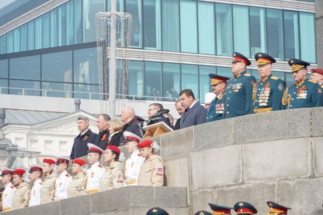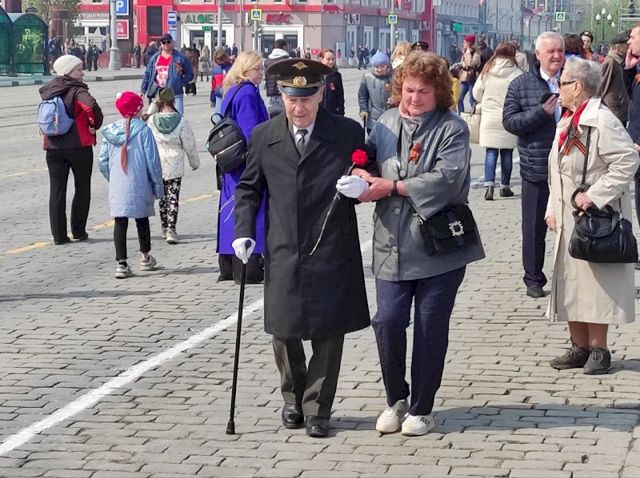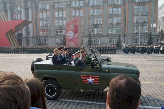 Традиционно перед парадом на площади 1905 года чествовали ветеранов Великой Отечественной войны, которых на УАЗе доставили к почетным местам у трибуны. Далее последовал торжественный вынос копии Знамени Победы, которая находится у участника Великой Отечественной войны полковника Владимира Степановича Лупейко. И сегодня ему исполнился 101 год