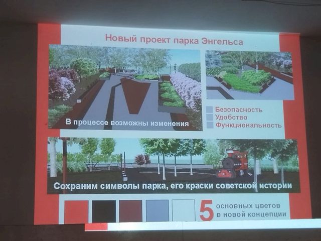 На заседании Совета неравнодушных горожан также были названы некоторые подробности грядущей реконструкции. Цветовая гамма парка выбрана в соответствии с советской эпохой. Базовыми цветами станут красный, черный, розовый, серый и белый. Там оборудуют качественное освещение. «Центрами света» станут входные группы парка (к слову, все они сохранятся на прежних местах), центральная площадь, детские и спортивные площадки, дорожки. При проектировании и установке освещения будут заложены необходимые коммуникации для последующего оборудования парка системой видеонаблюдения.