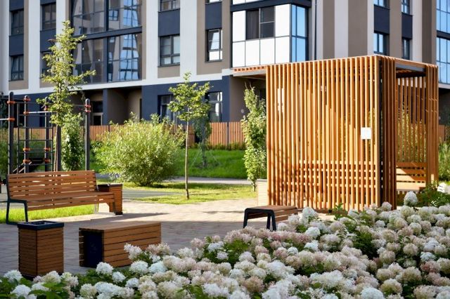 Во дворах жилого квартала установлены детские комплексы для разных возрастов из лиственницы. На площадках используется геопластика – мягкое резиновое покрытие, которое не только обладает амортизирующими свойствами, но и преображает ландшафт с помощью различных форм – холмов, гротов, горок и других фантазийных объектов.