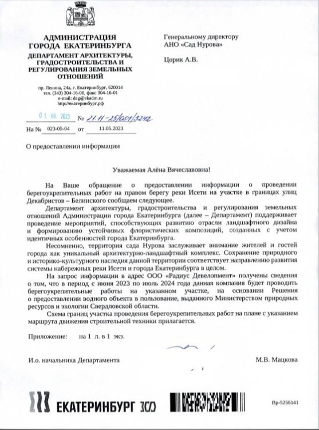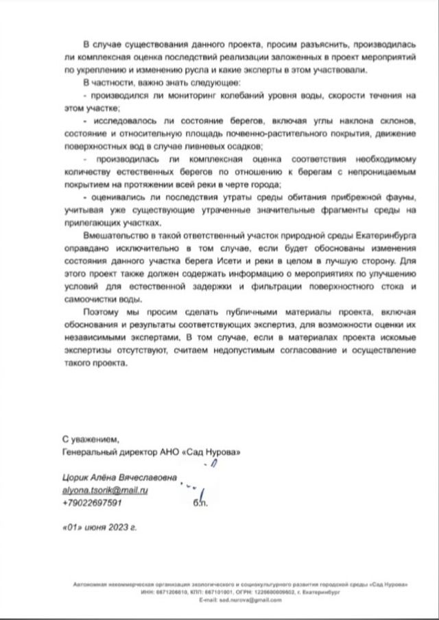 ЕАН обратился за разъяснениями в мэрию с вопросом о планах застройщика по возможному изменению русла реки или ее засыпке. Ответ пришел следующий: «На участке реки Исети в границах улиц Белинского - Декабристов предусмотрено проведение мероприятий по берегоукреплению. Развитие и благоустройство данной территории планируется в соответствии с концепцией, которая опубликована на официальном портале Екатеринбурга». Такой же ответ пришел организаторам «Сада Нурова».
