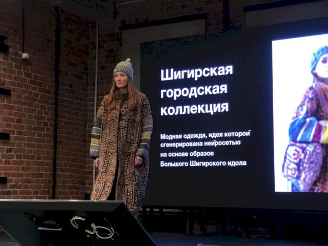На конференции предприниматели предложили свои варанты использования идола. Модельер и дизайнер Мария Варламова представила коллекцию одежды с использованием шигирской символики, разработанную нейросетью.