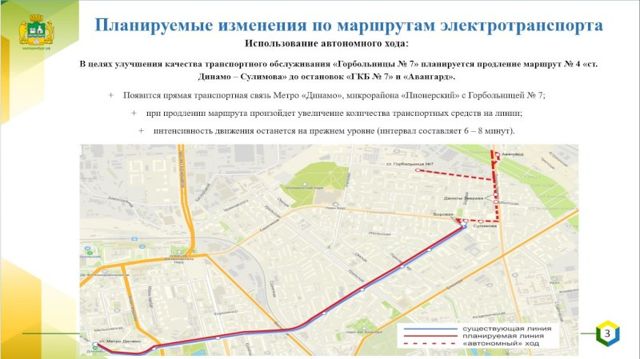 Маршрут № 4 «ст. Динамо – Сулимова» продлят до остановок «ГКБ № 7» и «Авангард»;