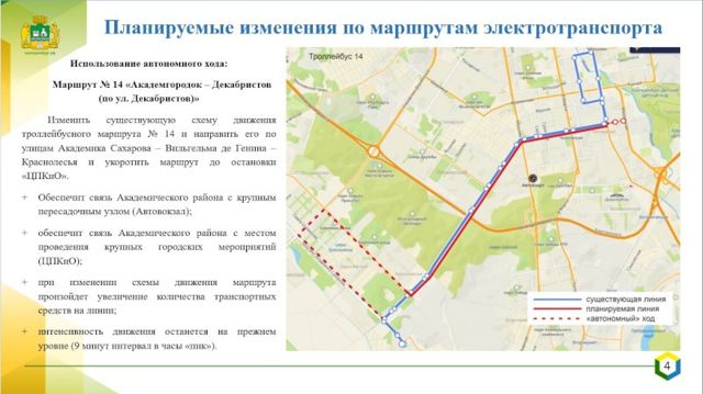 Маршрут № 14 «Академгородок – Декабристов (по ул. Декабристов)» изменится. Троллейбусы пойдут по улицам Академика Сахарова – Вильгельма де Геннина – Краснолесья до остановки «ЦПКиО».