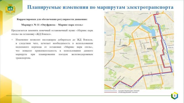 Маршрут № 11 «Онуфриева – Маринс парк отель» - конечный остановочный пункт «Маринс парк отель» переместится на остановку «Ж/д вокзал»;
