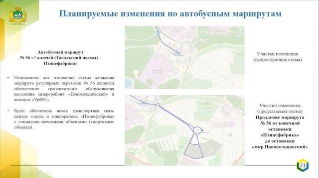 Маршрут № 56 «7 ключей (Тагильский подход) – Птицефабрика» будет продлен до Новокольцовского микрорайона;