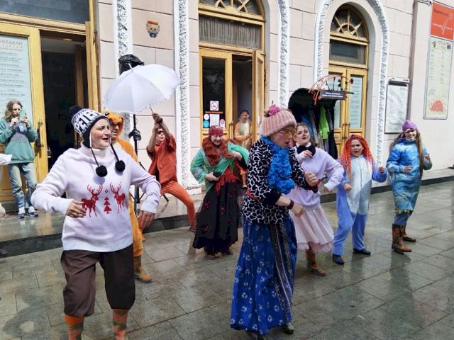 У «Коляда-театра» на проспекте Ленина начали прямо под дождем устанавливать небольшие декорации и пушку для выпуска пены. Когда капать перестало, у входа в театр включили музыку и трое актеров вышли на разогрев публики (которая отсутствовала). За десять минут до старта основной программы внезапно показалось солнце, небо на время очистилось от туч. Затем из-за дверей показался сам мэтр, заявивший без скромности, что лично попросил солнце выйти из-за облаков. Далее на улицу высыпали остальные актеры.