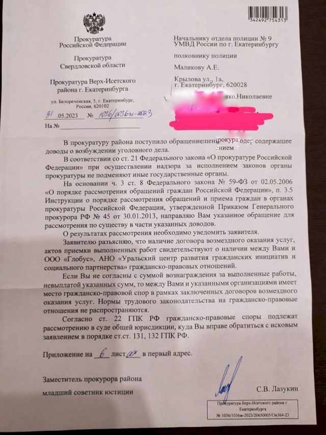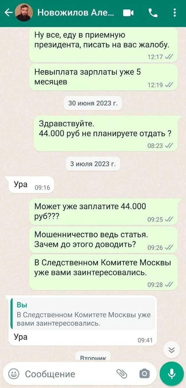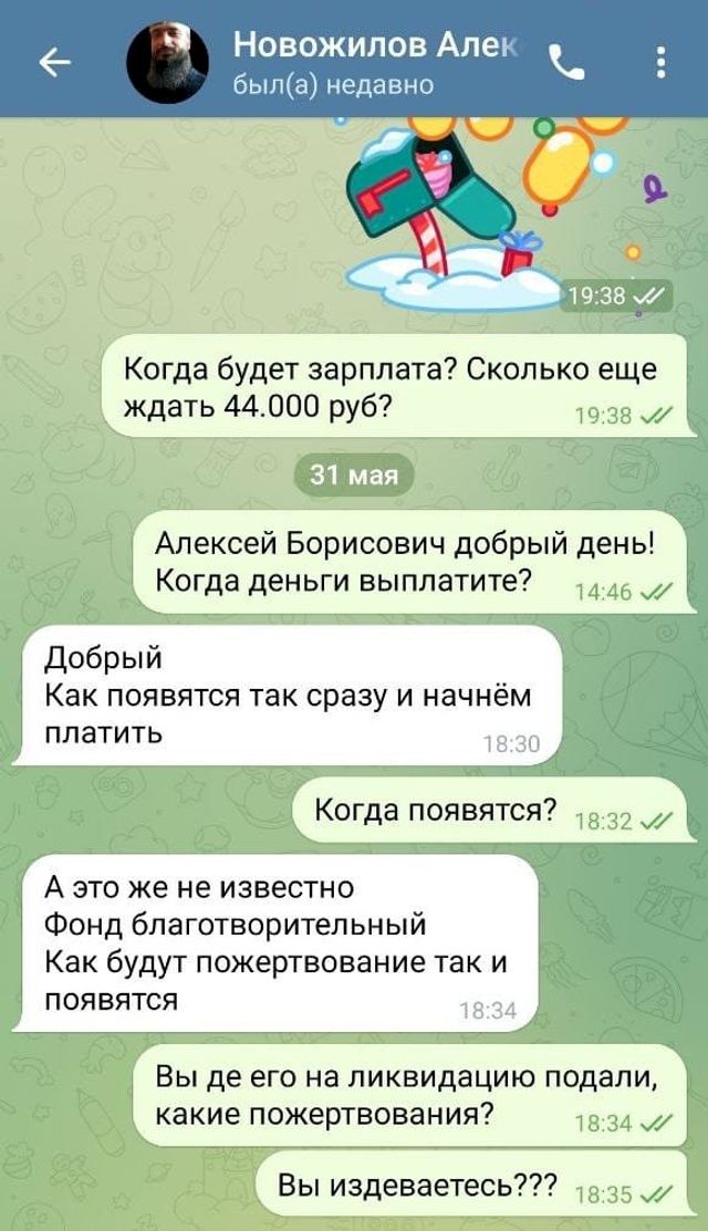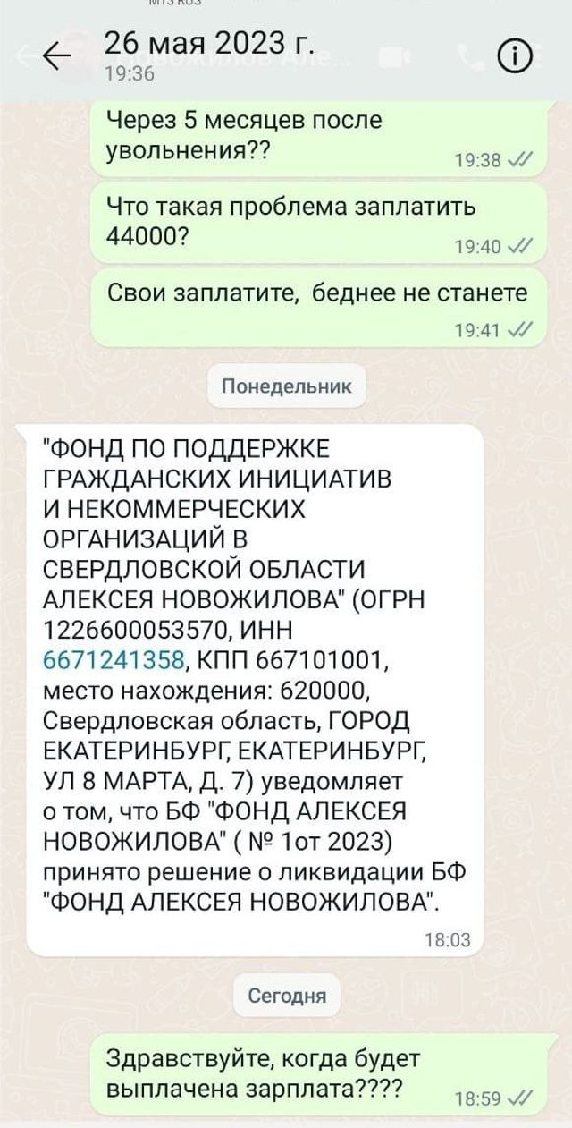 Еще одна обманутая бывшая сотрудница Екатерина Мудрова рассказала ЕАН свою историю сотрудничества с Алексеем Новожиловым. Девушка устроилась в центр арт-терапевтом в октябре прошлого года. Коллеги предупредили новенькую о том, что в организации бывают задержки зарплаты по два месяца. По словам Екатерины, сначала ей выплачивали вовремя, а тем, кто работал дольше, задерживали. Первые проблемы начались уже к декабрю 2022. Те, кто не получал зарплату уже 3-4 месяца, подняли бунт, в том числе и в СМИ. В итоге к новому году зарплату стали выдавать, последнюю выплатили в январе, и больше никто денег не видел. В марте сотрудников вынудили в связи с ликвидацией фонда подписать договор с неизвестным им ООО «Глобус», который, по словам работников, юридически не являлся поставщиком социальных услуг. На все вопросы от руководства получали один ответ: «Ну, так надо, подписывайте».