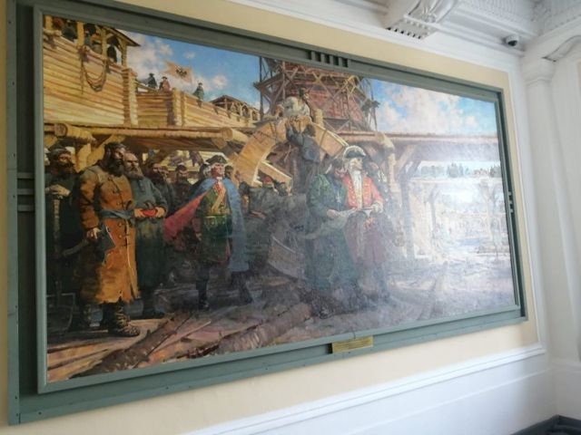 На входе в администрацию Екатеринбурга появилась уникальная картина, созданная специально к 300-летию города художником Александром Ремезовым. На ней изображено создание главной городской плотины.