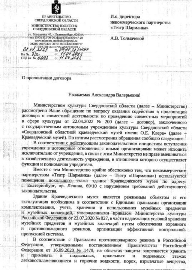Срок соглашения истек в апреле. В связи с тем, что совместных акций театром на протяжении длительного времени не инициировалось и не проводилось, музей посчитал заключение нового соглашения нецелесообразным. При этом у него есть большой портфель собственных проектов, которые ожидают воплощения», - заявили ЕАН в департаменте информационной политики Свердловской области (музей имени Клера - государственная организация, подведомственная региональному Министерству культуры).